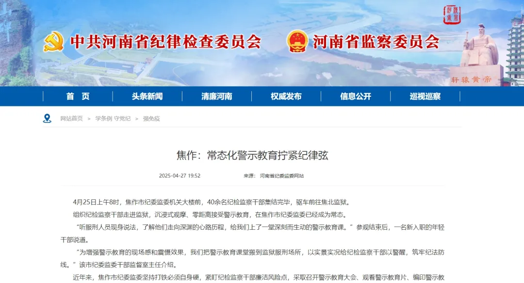 4月25日,焦作市纪委监委组织40余名纪检监察干部走进焦北监狱,沉浸式观摩、零距离接受警示教育。