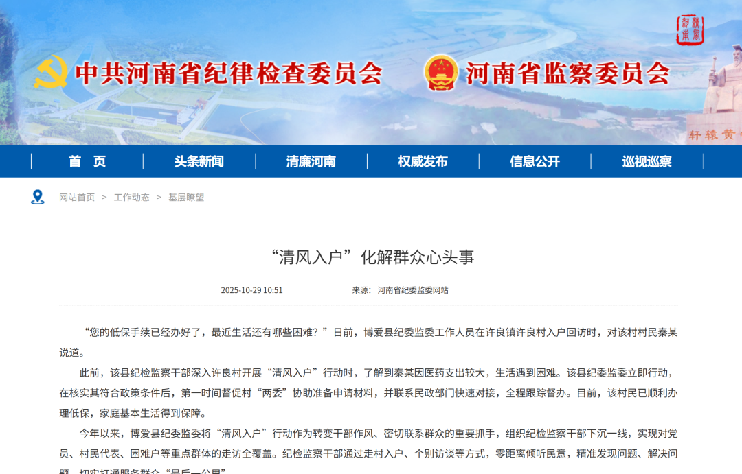 今年以来,博爱县纪委监委将“清风入户”行动作为转变干部作风、密切联系群众的重要抓手,组织纪检监察干部下沉一线,实现对党员、村民代表、困难户等重点群体的走访全覆盖。纪检监察干部通过走村入户、个别访谈等方式,零距离倾听民意,精准发现问题、解决问题,切实打通服务群众“最后一公里”。