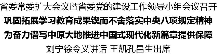 9月6日,省委常委扩大会议暨省委党的建设工作领导小组会议召开。省委书记刘宁主持并讲话,强调要学思践悟习近平总书记关于深入贯彻中央八项规定精神学习教育的重要指示和在河南考察时重要讲话精神,落实中央党的建设工作领导小组会议精神,总结我省学习教育工作,锲而不舍落实中央八项规定精神,推进作风建设常态化长效化。中央第二指导组组长徐令义出席并讲话,副组长李勇及成员到会指导。省长王凯、省政协主席孔昌生和其他省级领导同志出席。