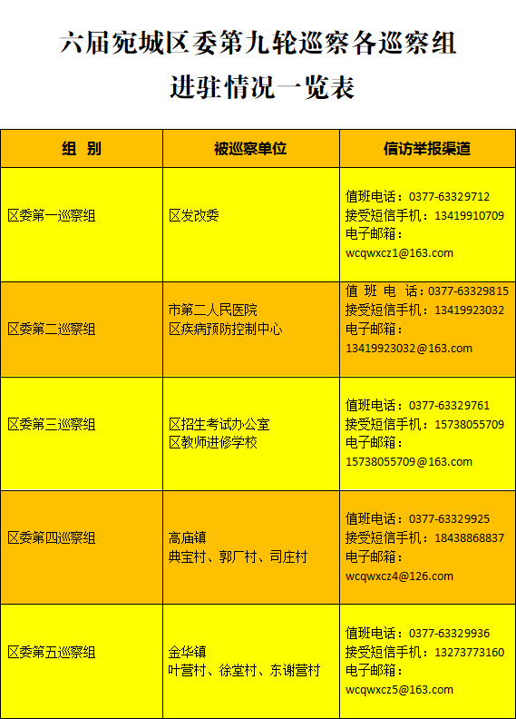 附:六届宛城区委第九轮巡察各巡察组进驻情况一览表