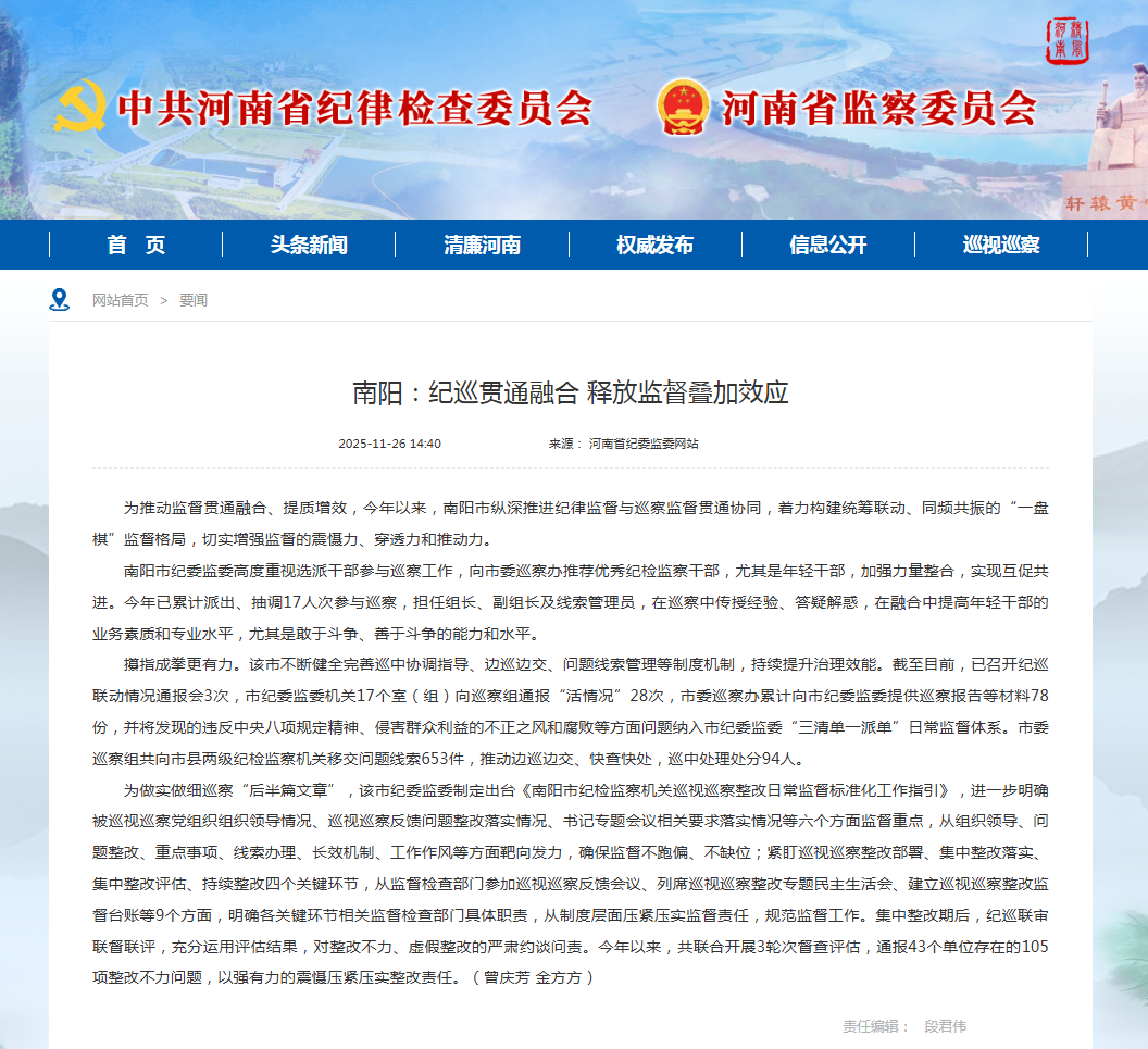 为推动监督贯通融合、提质增效,今年以来,南阳市纵深推进纪律监督与巡察监督贯通协同,着力构建统筹联动、同频共振的“一盘棋”监督格局,切实增强监督的震慑力、穿透力和推动力。