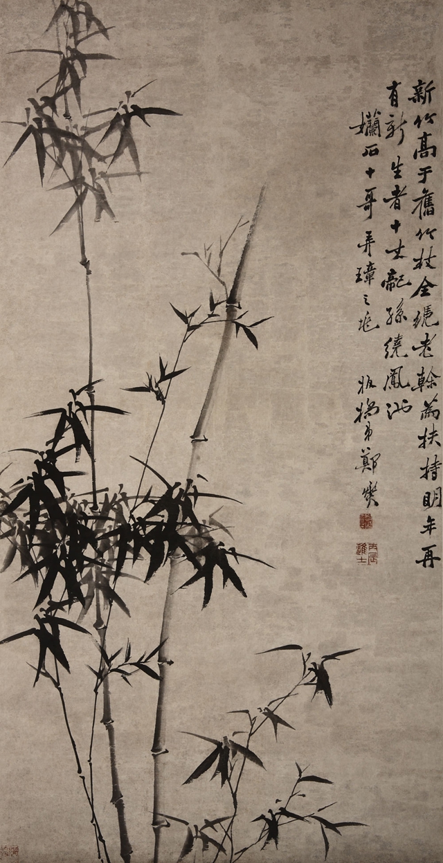 郑板桥《墨竹图轴》,题画诗的前两句为“新竹高于旧竹枝,全凭老干为扶持”。 扬州博物馆供图
