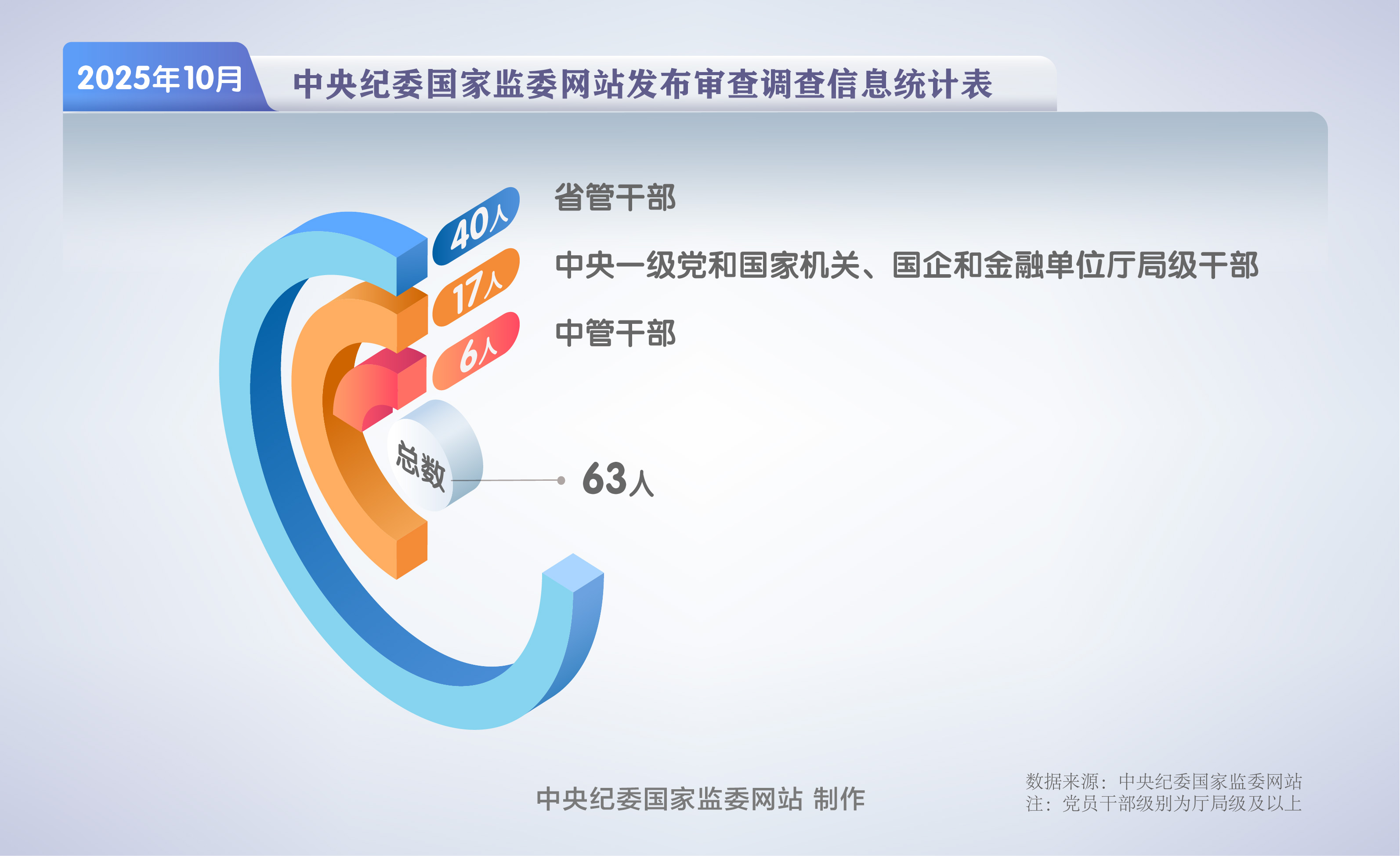 2025年10月,中央纪委国家监委网站共发布63名党员、干部接受审查调查信息。其中,中管干部6名,中央一级党和国家机关、国企和金融单位厅局级干部17名,省管干部40名。