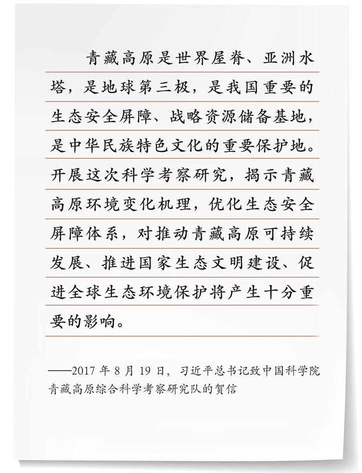 青藏高原是世界屋脊、地球第三极、亚洲水塔,对全国、全亚洲乃至全世界气候变化影响深远;这里地质、地理资源独特,被科学界称作“天然实验室”。2017年8月,第二次青藏科考正式启动,习近平总书记致贺信并希望参加科学考察的全体科研人员、青年学生和保障人员发扬老一辈科学家艰苦奋斗、团结奋进、勇攀高峰的精神,聚焦水、生态、人类活动,着力解决青藏高原资源环境承载力、灾害风险、绿色发展途径等方面的问题,为守护好世界上最后一方净土、建设美丽的青藏高原作出新贡献,让青藏高原各族群众生活更加幸福安康。