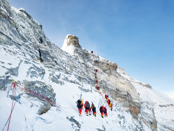 2023年5月23日12时30分许,2023年珠峰科考13名登顶队员成功登顶地球之巅珠穆朗玛峰。这是我国珠峰科考继2022年之后,再次突破8000米以上海拔高度。图为当日,2023年珠峰科考登顶队员在冲顶。新华社特约记者 拉巴 摄