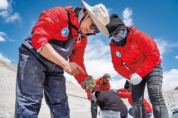 2023年珠峰地区综合科学考察研究,是第二次青藏高原综合科学考察研究的一部分。今年5月,来自5支科考分队13支科考小组的170名科考队员,在珠峰地区探索自然,追问科学,奋勇攀登。图为科考队员张继峰(左)在查看附着在石头上的藻类生物。 新华社记者 孙非 摄