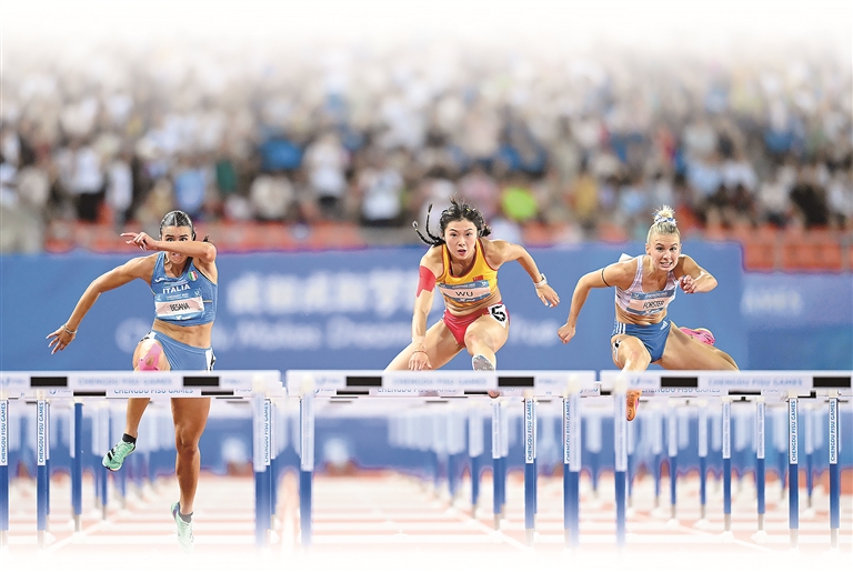8月4日,在成都举行的第31届世界大学生夏季运动会田径项目女子100米栏决赛中,中国选手吴艳妮以12秒76的成绩夺得亚军。图为吴艳妮(中)在比赛中。 新华社记者 邓华 摄
