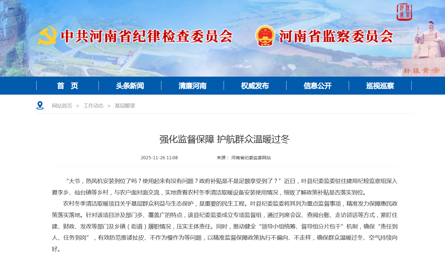 农村冬季清洁取暖项目关乎基层群众利益与生态保护,是重要的民生工程。叶县纪委监委将其列为重点监督事项,精准发力保障惠民政策落实落地。针对该项目涉及部门多、覆盖广的特点,该县纪委监委成立专项监督组,通过列席会议、查阅台账、走访谈话等方式,紧盯住建、财政、发改等部门及乡镇(街道)履职情况,压实主体责任。同时,推动健全“领导小组统筹、督导组分片包干”机制,确保“责任到人、任务到岗”,有效防范推诿扯皮、不作为慢作为等问题,以精准监督保障政策执行不偏向、不走样,确保群众温暖过冬、空气持续向好。