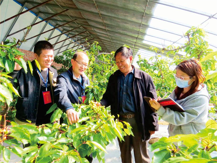 义马市纪委监委工作人员在程村社区集体产业园向社区干部了解樱桃产业及集体“三资”管理情况。