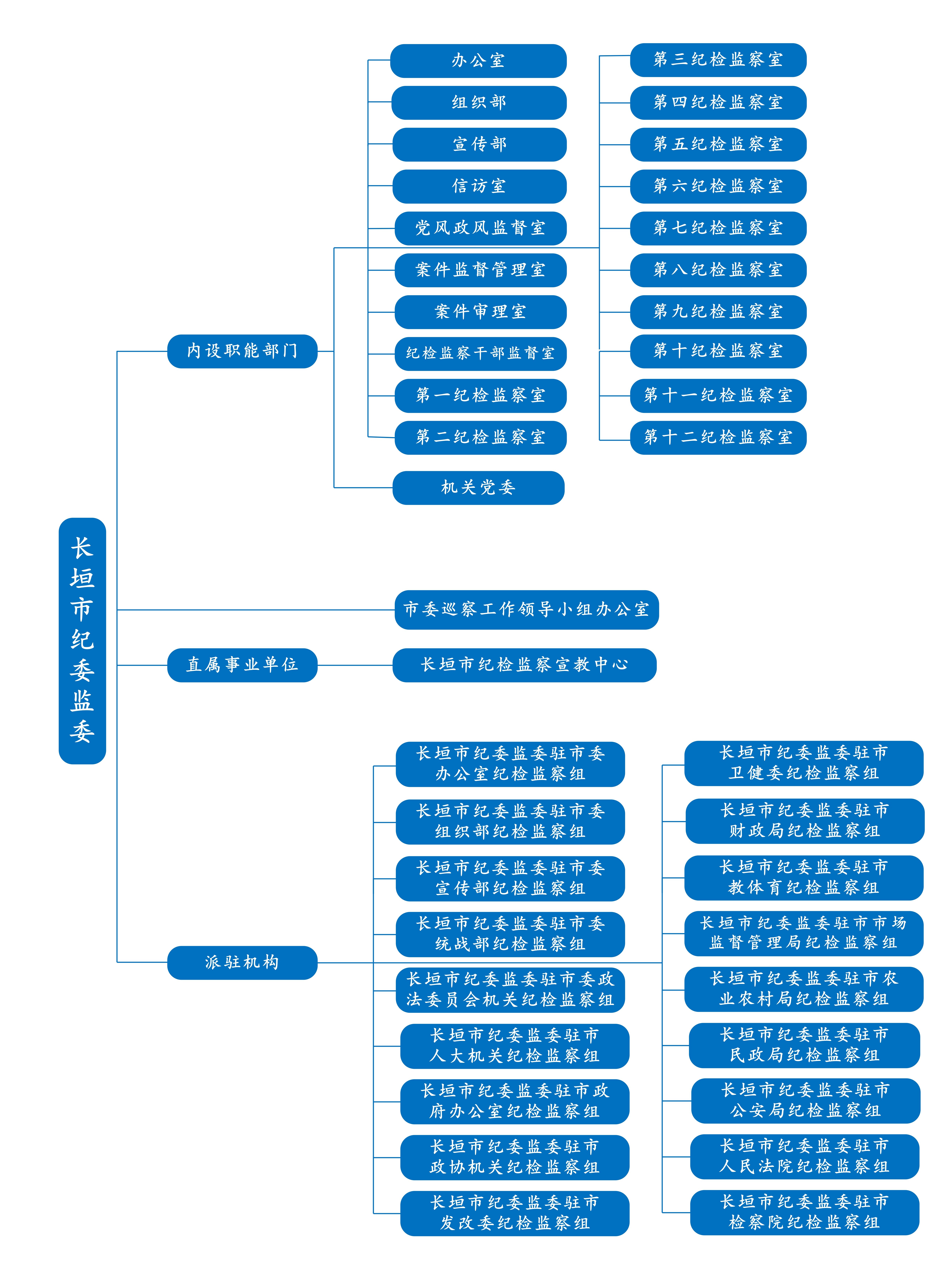 中国共产党长垣市纪律检查委员会机关与长垣市监察委员会合署办公,共有20个内设机构,分别为:办公室、组织部、宣传部、信访室、案件监督管理室、案件审理室、党风政风监督室、第一至第十二纪检监察室、纪检监察干部监督室,单列机关党委,所属1个事业单位:长垣市纪检监察宣教中心。实行统一管理的派驻机构18个。