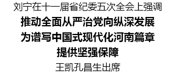 1月14日,十一届省纪委五次全会在郑州召开。省委书记刘宁出席并讲话,强调要全面贯彻落实党的二十大和二十届二中、三中全会精神,深入贯彻二十届中央纪委四次全会精神,学习领会习近平总书记关于党的自我革命重要思想和关于河南工作的重要讲话重要指示批示精神,始终保持反腐败永远在路上的坚韧执着,增强战略定力,强化高压态势,推动全面从严治党向纵深发展,为谱写新时代中原更加出彩的绚丽篇章提供坚强保障。省长王凯、省政协主席孔昌生出席会议。中央纪委国家监委有关同志到会指导。