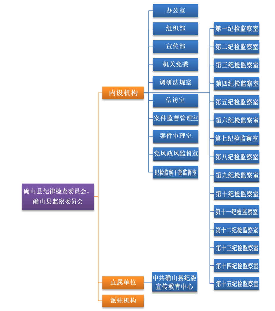 确山县纪委机关与确山县监察委合署办公,共有25个内设机构,分别为:办公室、组织部、宣传部、机关党委、调研法规室、信访室、案件监督管理室、案件审理室、党风政风监督室、第一至第十五纪检监察室、纪检监察干部监督室。下属1个事业单位:中共确山县纪委宣传教育中心。实行统一管理的派驻机构15个。