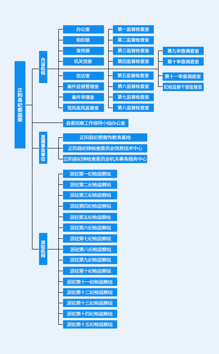 根据党章、监察法有关规定,正阳县纪委监委统一设立派驻机构,名称为中共正阳县纪律检查委员会、正阳县监察委员会派驻第×纪检监察组,派驻纪检监察组按自然数序列排序,共设15个派驻县一级党和国家机关纪检监察组,其中,综合派驻12个,单独派驻3个。