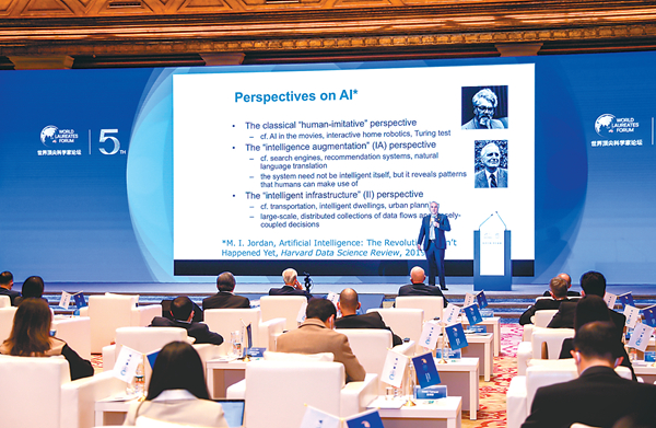 11月6日,主题为“科学向新 共创未来”的第五届世界顶尖科学家论坛在上海开幕。开幕式上还举行了首届世界顶尖科学家协会奖颁奖典礼。图为当日,2022年世界顶尖科学家协会奖“智能科学或数学奖”得主、美国计算机科学与统计学家迈克尔·I·乔丹在开幕式上发表演讲。新华社发