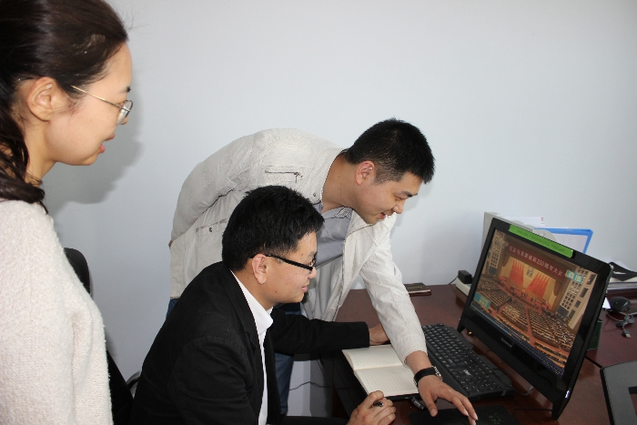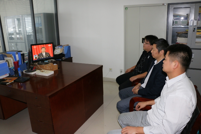 市纪委监察委党员干部围坐在办公室电脑前收看大会直播,认真聆听习近平总书记重要讲话精神。
