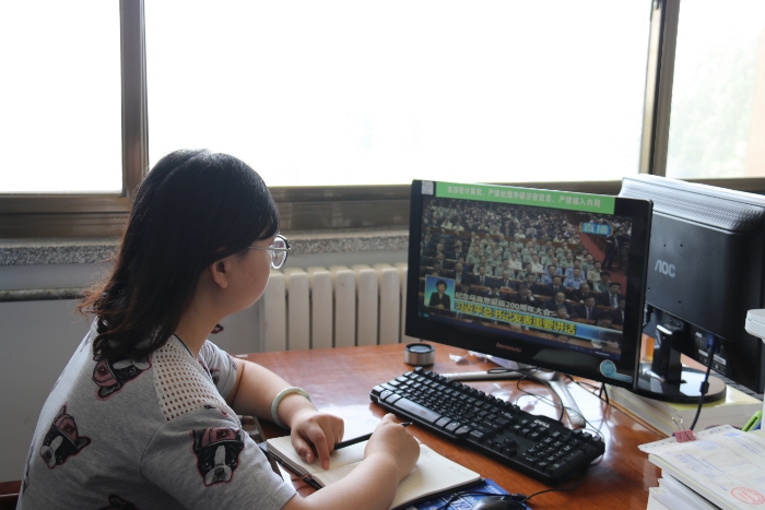 鹤山区纪委监察委转隶干部边看直播边做笔记,把习近平总书记的重要讲话精神铭记于心。