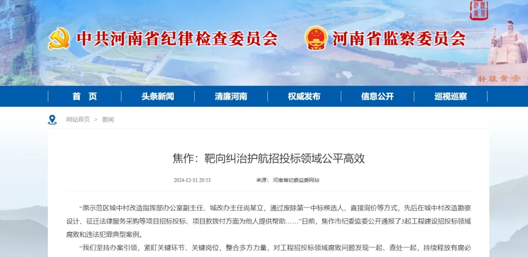 “原示范区城中村改造指挥部办公室副主任、城改办主任尚某立,通过废除第一中标候选人、直接询价等方式,先后在城中村改造勘察设计、征迁法律服务采购等项目招标投标、项目款拨付方面为他人提供帮助……”日前,焦作市纪委监委公开通报了3起工程建设招投标领域腐败和违法犯罪典型案例。