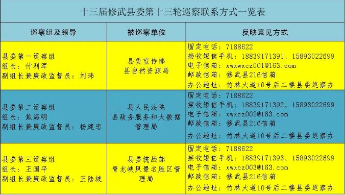 巡察进驻期间,修武县委各巡察组均开通举报电话、接收短信手机、电子信箱、举报箱、邮政信箱。巡察组受理信访举报时间为2020年11月17日至12月31日工作日8:00-17:30,巡察结束后信访渠道自动关闭。巡察组主要受理反映被巡察单位领导班子及其成员问题的来信、来电、来访。对其他与巡察工作无直接关系的个人诉求、涉法涉诉等信访问题,将按照分级负责、属地管理原则,转交有关单位办理。