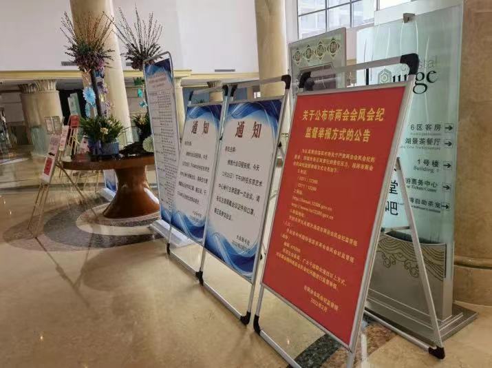 市人大会议会风会纪监督组在会议驻地醒目位置张贴《关于公布市两会会风会纪监督举报方式的公告》。(许彦波 摄)