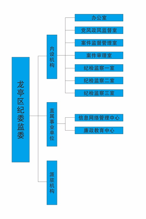 龙亭区纪委机关和龙亭区监委合署办公,共有7个内设机构,分别为:办公室、案件审理室、案件监督管理室、党风政风监督室、纪检监察一室、纪检监察二室、纪检监察三室。下属2个事业单位:信息网络管理中心、廉政教育中心。设置3个综合派驻纪检监察组:区纪委监察委驻区委办公室纪检监察组、区纪委监察委驻区政府办公室纪检监察组、区纪委监察委驻区人大、政协常委会机关纪检监察组。设置2个单独派驻纪检监察组:区纪委监委驻区法院纪检监察组、区纪委监委驻区检察院纪检监察组。