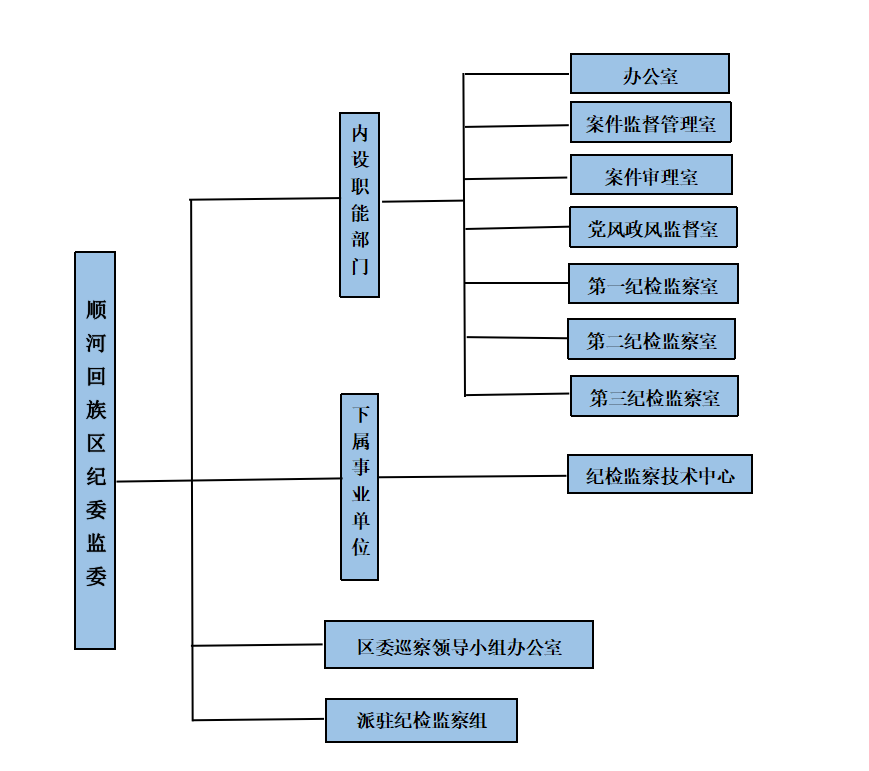 顺河回族区纪委机关和顺河回族区监委合署办公,共有5个内设机构,分别为:办公室、案件审理室、案件监督管理室、党风政风监督室、第一至第三纪检监察室。下属1个事业单位:顺河回族区纪检监察技术中心。共设置3个综合派驻纪检监察组和2个单独派驻纪检监察组。