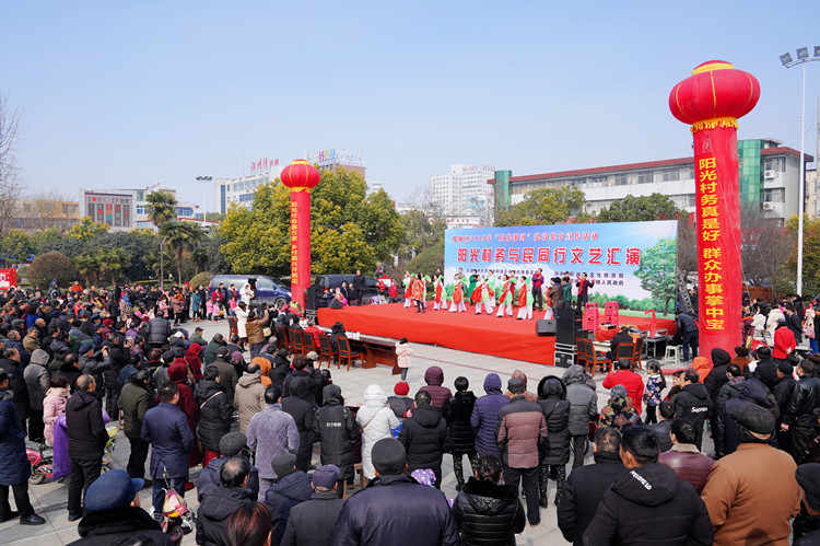 2月16日,郾城区黄河广场热闹非凡,郾城区“阳光村务与民同行文艺汇演”正在这里演出,该区各镇(街道)文艺宣传队员们打快板、唱小戏、演小品、讲案例,精彩的表演引来掌声笑声不断,吸引了附近八百余名群众前来观看。