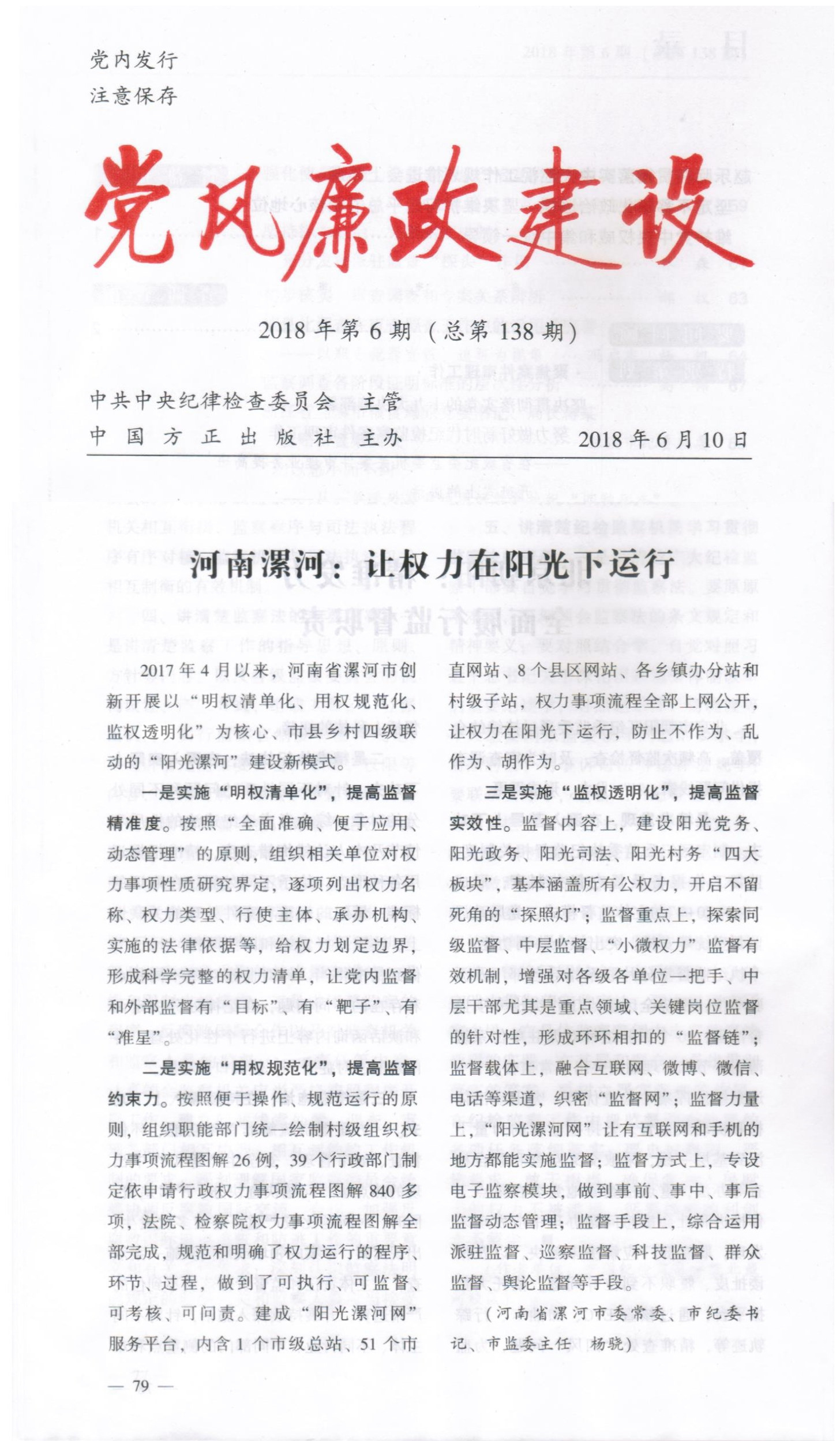 【党风廉政建设】刊发杨骁书记署名文章:河南漯河 让权力在阳光下运行