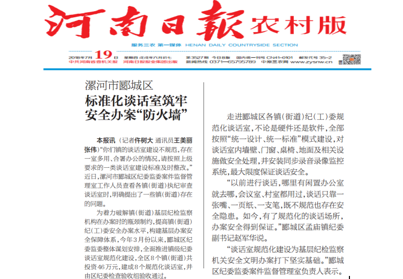 为着力破解镇(街道)基层纪检监察机构在办案时的瓶颈制约,提高镇(街道)纪(工)委安全办案水平,构建基层办案安全保障体系,今年3月份以来,郾城区纪委监委整体谋划安排,全面推进镇级纪委谈话室规范化建设,全区8个镇(街道)共投资46万元,建成8个规范化谈话室,并由区纪委检查验收组验收通过。