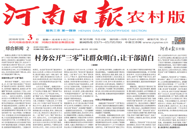 临颍县推行“阳光村务”“三零”模式以来,找到了基层党风廉政建设和反腐败工作的有效抓手,探索出了基层党的建设的有效途径,为党的建设高质量、经济发展高质量提供了坚强保障。