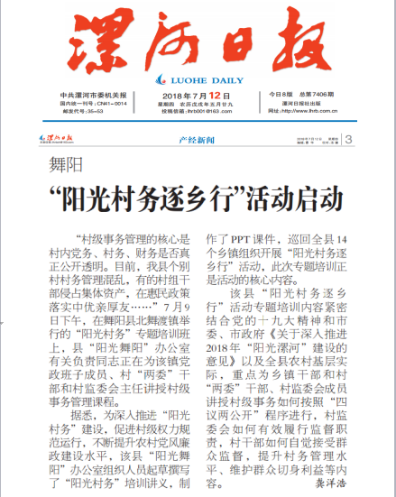 该县“阳光村务逐乡行”活动专题培训内容紧密结合党的十九大精神和市委、市政府《关于深入推进2018年“阳光漯河”建设的意见》以及全县农村基层实际,重点为乡镇干部和村“两委”干部、村监委会成员讲授村级事务如何按照“四议两公开”程序进行,村监委会如何有效履行监督职责,村干部如何自觉接受群众监督,提升村务管理水平、维护群众切身利益等内容。龚洋浩