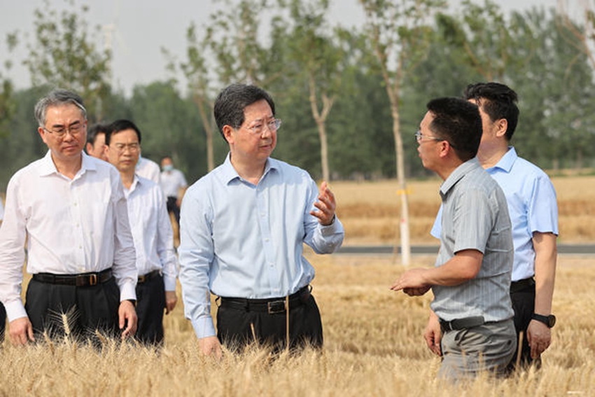 6月8日,省委书记楼阳生在兰考县红庙镇高标准农田里查看小麦夏收情况。顶端新闻·河南日报记者 董亮 蔡迅翔 摄