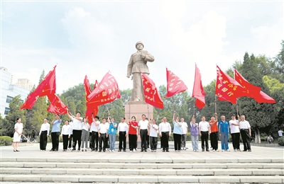 近日,由辽宁省抚顺市和辽宁石油化工大学联合组织开展的“重走雷锋路 青春报国行”高校学子社会实践活动在抚顺市雷锋纪念馆启动。图为嘉宾为参加社会实践活动的团队授旗。 新华社记者 逯阳 摄