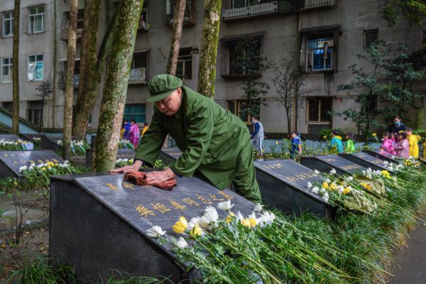 4月2日,四川省仁寿县开展清明节缅怀英烈活动,参观革命烈士纪念馆、向烈士敬献鲜花、聆听英雄事迹等。图为党员干部为烈士墓碑除尘。(四川省仁寿县纪委监委 李艾伦 摄)