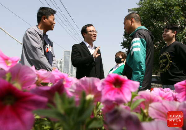 在河南省焦作市博爱县清化街道办事处一居民区内,刚荣获博爱县“五一劳动奖章”的街道办事处人民调解委员会主任王军华正在为居民们调解纠纷。(河南省博爱县纪委监委供 程全 摄)