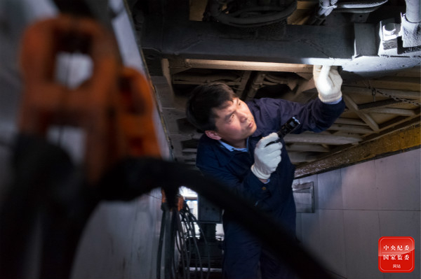 与灰尘相伴,与污渍为伍,作为公交修理技术主管,上海市浦东新区公共交通有限公司修理公司的张瑞祥反复检查着车辆零部件,用汗水守护营运安全。(上海市浦东新区公共交通有限公司纪委供 杨咏 摄)