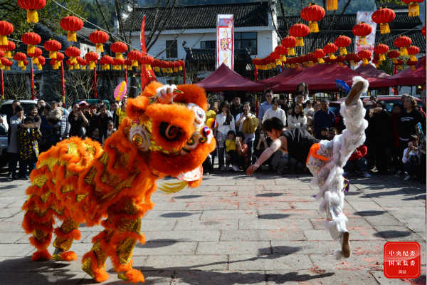 鼓乐盛世,舞狮太平。在大年初五这一天,浙江省武义县俞源乡舞狮者上穿黑色袖衫、下穿灯笼裤,为当地老百姓舞狮迎春,祈求新的一年风调雨顺、生活吉祥如意。(浙江省武义县纪委监委供 徐宇 摄)