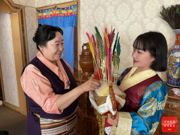 今年的藏历新年和春节是同一天,雪域大地弥漫着双倍的喜庆。大年初五,人们纷纷走亲戚、串家门。来到主人家里,他们就会献上“切玛”,你从左边的穗子里拿一点出来抛向空中,再从右边的糌粑拿一点出来放进嘴里,边拿边喊“扎西德勒”,预祝新春如意、身体康健。(西藏自治区纪委监委 索朗次仁 摄)