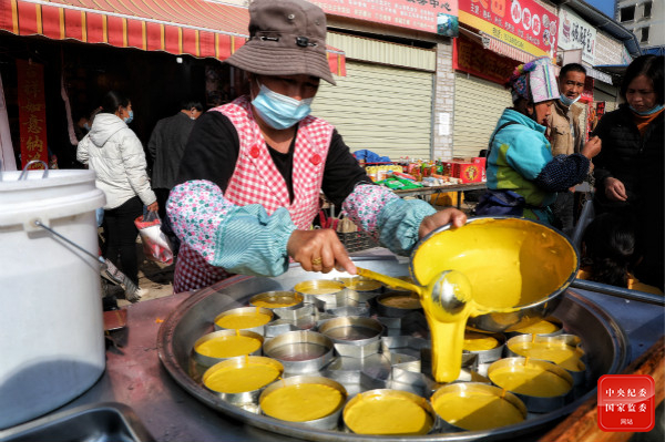 在云南省文山市,百姓素有初五吃年糕的风俗。年糕通常有白色和黄色两种,象征着金银,表达了人们希望生活越来越好、一年更比一年高的期盼。图为摊贩在制作年糕。(云南省文山市纪委监委 王铭坚 摄)
