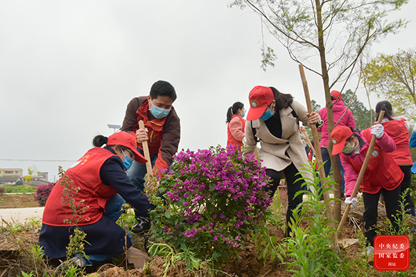 广西壮族自治区蒙山县纪委监委组织50多名纪检监察干部志愿者到新圩镇新圩村河堤路旁开展“清风暖春”植树活动,保护河堤两岸水土,美化河堤环境。(广西壮族自治区梧州市蒙山县纪委监委 林志清 摄)
