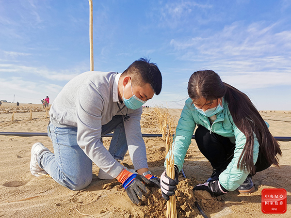 寒意未退尽,植树正当时。新疆维吾尔自治区巴州且末县纪委监委组织干部来到与县城仅有一河之隔的塔克拉玛干大沙漠,以实际行动建设绿色家园,改善生态环境。(新疆维吾尔自治区巴州且末县纪委监 委迪力夏提·多力昆 摄)