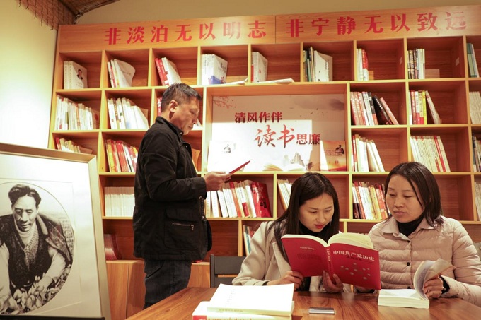 兰考县张庄村廉政文化园成为群众浸润书香气息的精神宝地,大家在书的海洋里,汲取丰富的知识。(兰考县纪委监委 刘涵 摄)