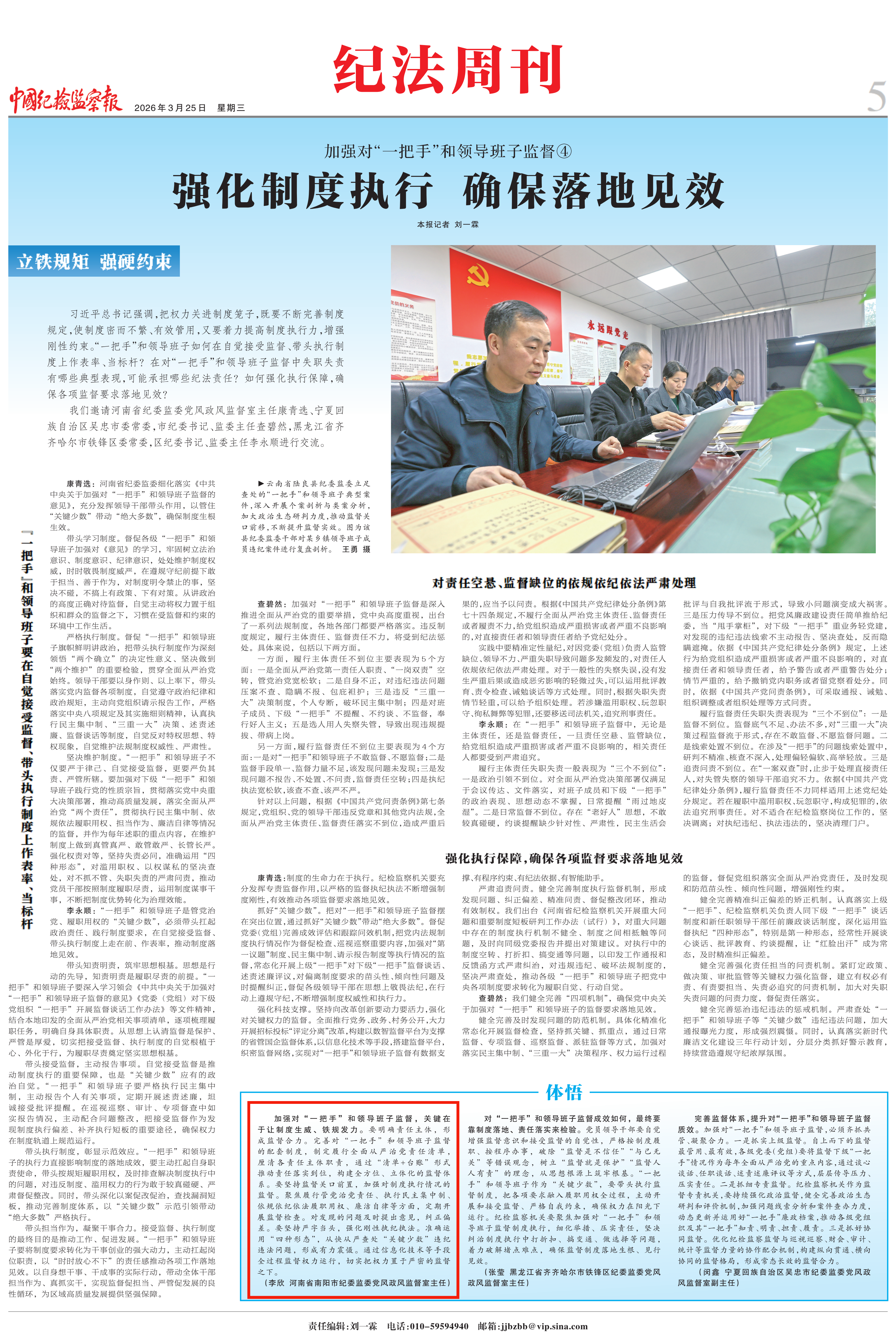 加强对“一把手”和领导班子监督,关键在于让制度生威、铁规发力。要明确责任主体,形成监督合力。完善对“一把手”和领导班子监督的配套制度,制定履行全面从严治党责任清单,厘清各责任主体职责,通过“清单+台账”形式推动责任落实到位,构建全方位、立体化的监督体系。要坚持监督关口前置,加强对制度执行情况的监督。聚焦履行管党治党责任、执行民主集中制、依规依纪依法履职用权、廉洁自律等方面,定期开展监督检查。对发现的问题及时提出意见,纠正偏差。要坚持严字当头,强化刚性执纪执法。准确运用“四种形态”,从快从严查处“关键少数”违纪违法问题,形成有力震慑。通过信息化技术等手段全过程监督权力运行,切实把权力置于严密的监督之下。(李欣 河南省南阳市纪委监委党风政风监督室主任)