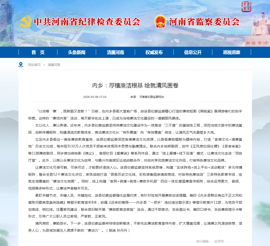 立足内乡县衙这一省级廉政教育基地,该县纪委监委深挖官德廉洁文化资源,以县衙廉政楹联为精神内核,打造“官德文化+清廉基地”历史文化线,每年吸引30万人次党员干部前来体悟民本思想与勤廉理念。联合内乡宛梆剧团,创作《正风肃纪保社稷》《县官审案》等11部廉政剧目,同步推出微电影《拂尘》、音频栏目《爱廉说》等系列作品,通过“线上展播+线下巡演”模式,让廉洁文化走进“百姓厅堂”。此外,以高以永廉洁文化为纽带,与嘉兴市南湖区达成战略合作,共创共享优质廉洁文化作品,打响特色廉洁文化品牌。