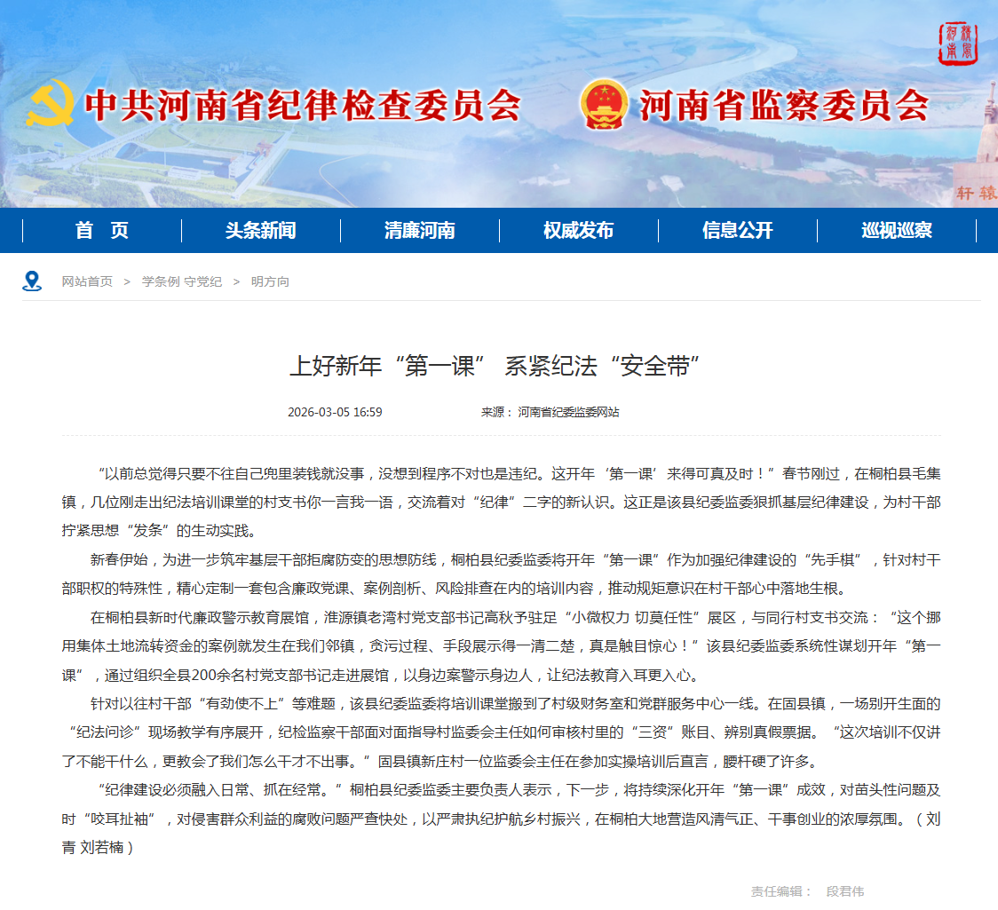 “以前总觉得只要不往自己兜里装钱就没事,没想到程序不对也是违纪。这开年‘第一课’来得可真及时!”春节刚过,在桐柏县毛集镇,几位刚走出纪法培训课堂的村支书你一言我一语,交流着对“纪律”二字的新认识。这正是该县纪委监委狠抓基层纪律建设,为村干部拧紧思想“发条”的生动实践。