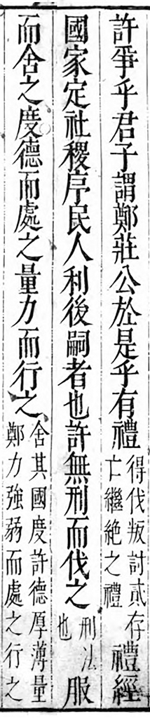 春秋时期,宗周社会的礼乐文明走向瓦解,但社会变迁也引起了人们对礼的反思和重建。郑玄云:“左氏善于礼。”《左传》中礼的思想极为浓厚,礼几乎成了衡量一切的标准,甚至可称为一部礼书。《左传》对礼的由来、本质、作用等都有着深刻论述。《左传》云:“礼,经国家,定社稷,序民人,利后嗣者也。”“礼,上下之纪,天地之经纬也,民之所以生也,是以先王尚之。故人之能自曲直以赴礼者,谓之成人。”“礼,国之干也。敬,礼之舆也。不敬,则礼不行;礼不行,则上下昏,何以长世?”