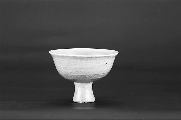 第二件是元代龙泉窑的创新产品——高足杯,这件高足杯的足呈喇叭状,顶着一个口微向外撇的圆杯;青绿釉泛灰,通体冰裂纹;内壁上、下部各刻划一圈细弦纹,内底模印一图案,模糊不清;外壁上部刻划四道弦纹和五级短斜线,下部用三齿篦梳刻划五瓣花卉,“五线谱纹”是人们对此类纹样的通俗称谓。高足杯在元代较为多见,不仅龙泉窑烧造,其他窑口也大量烧造,其流行原因与蒙古族的生活习惯有密切关系,高足杯又有“马上杯”之称,很方便他们在马上执足饮酒,豪放的蒙古人没有酒,就像草原上没有长调一样乏味,江西高安曾出土一批元代青花瓷,其中一件上书“人生百年常在醉,算来三万六千场”。