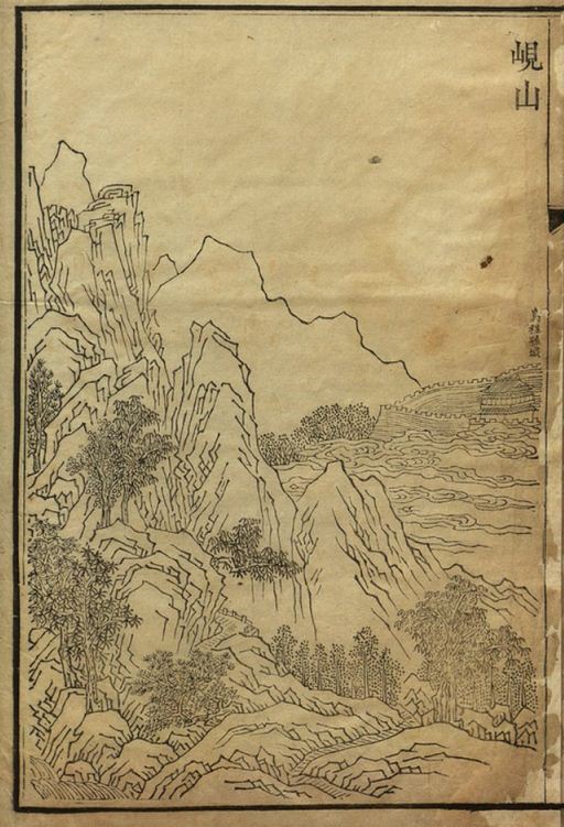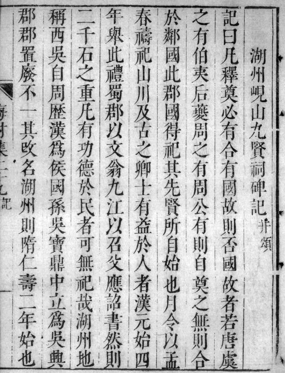 吴绮在湖州任官时,将岘山(上图,选自《名山图》)上的三贤祠增扩为九贤祠,祠中供奉王羲之、颜真卿、苏轼等在湖州任官的名贤,同时代著名文学家吴伟业曾写《湖州岘山九贤祠碑记》(下图,选自《梅村集》)以记其事。