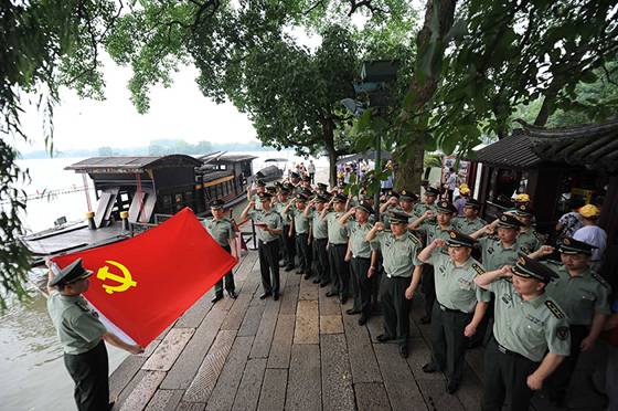 部队官兵在南湖红船边重温入党誓词。李剑铭 / 摄