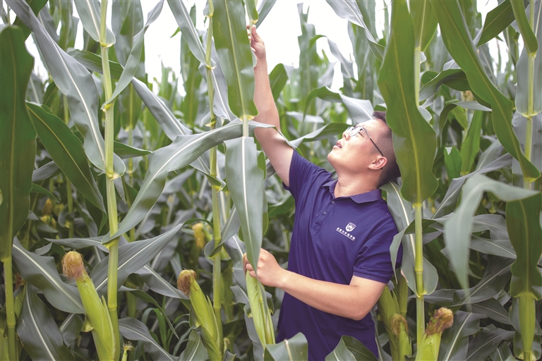 图为近日,在位于吉林省四平市梨树县四棵树乡三棵树村的“科技小院”,中国农业大学博士后沙野查看试验田玉米长势。