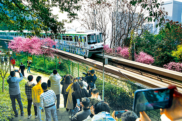 重庆轨道交通2号线佛图关段大面积美人梅竞相绽放,列车穿行在“花海”中,被称为重庆版“开往春天的列车”,吸引众多民众前来观赏打卡。图为市民游客前来拍照。 图片来源:视觉中国
